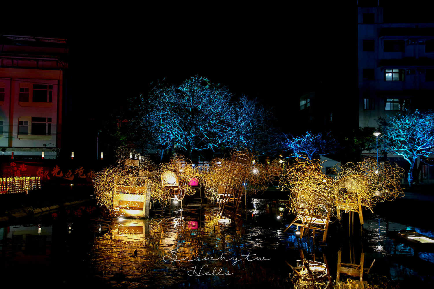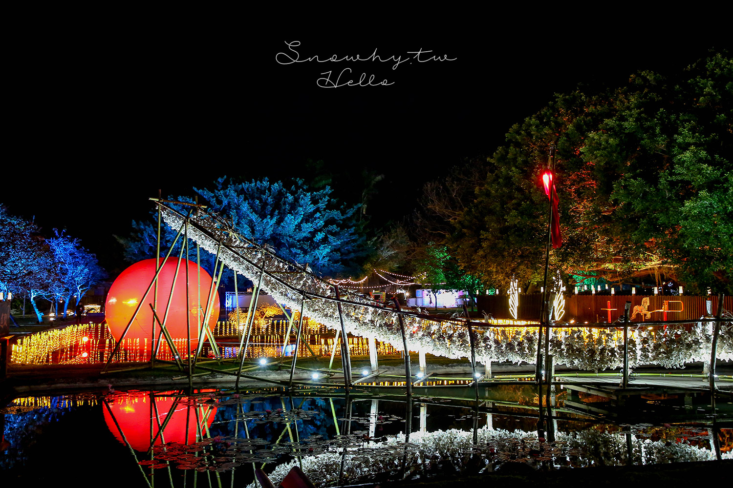 造訪時適逢北港燈會期間,園區內放置許多打燈的裝置藝術,也包括一些在慢濾池上的作品。