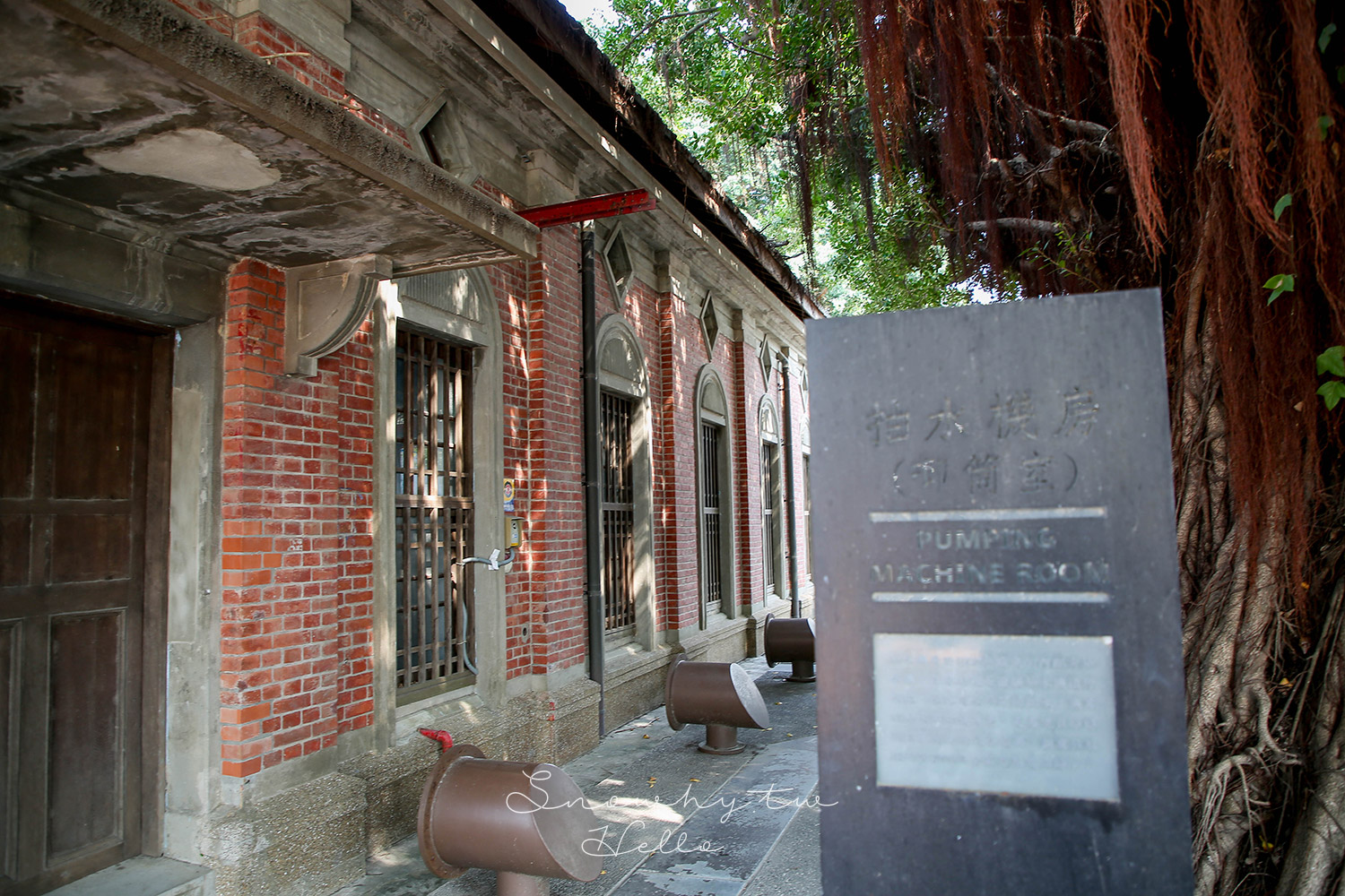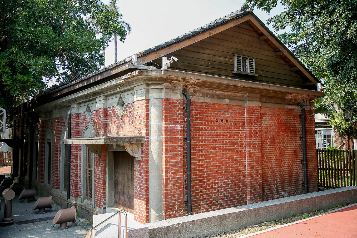 大水塔一旁的抽水機房,以鋼筋混凝土搭配清水磚砌成,立面點綴著拱形與菱形窗,使這座功能性建築多了幾分美感。
