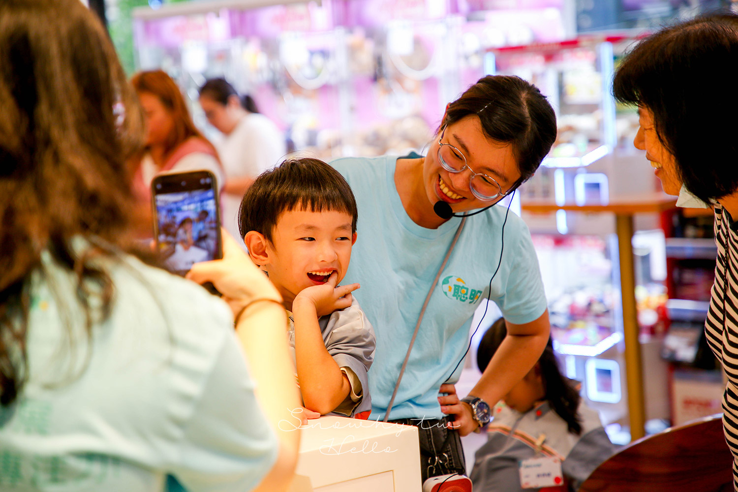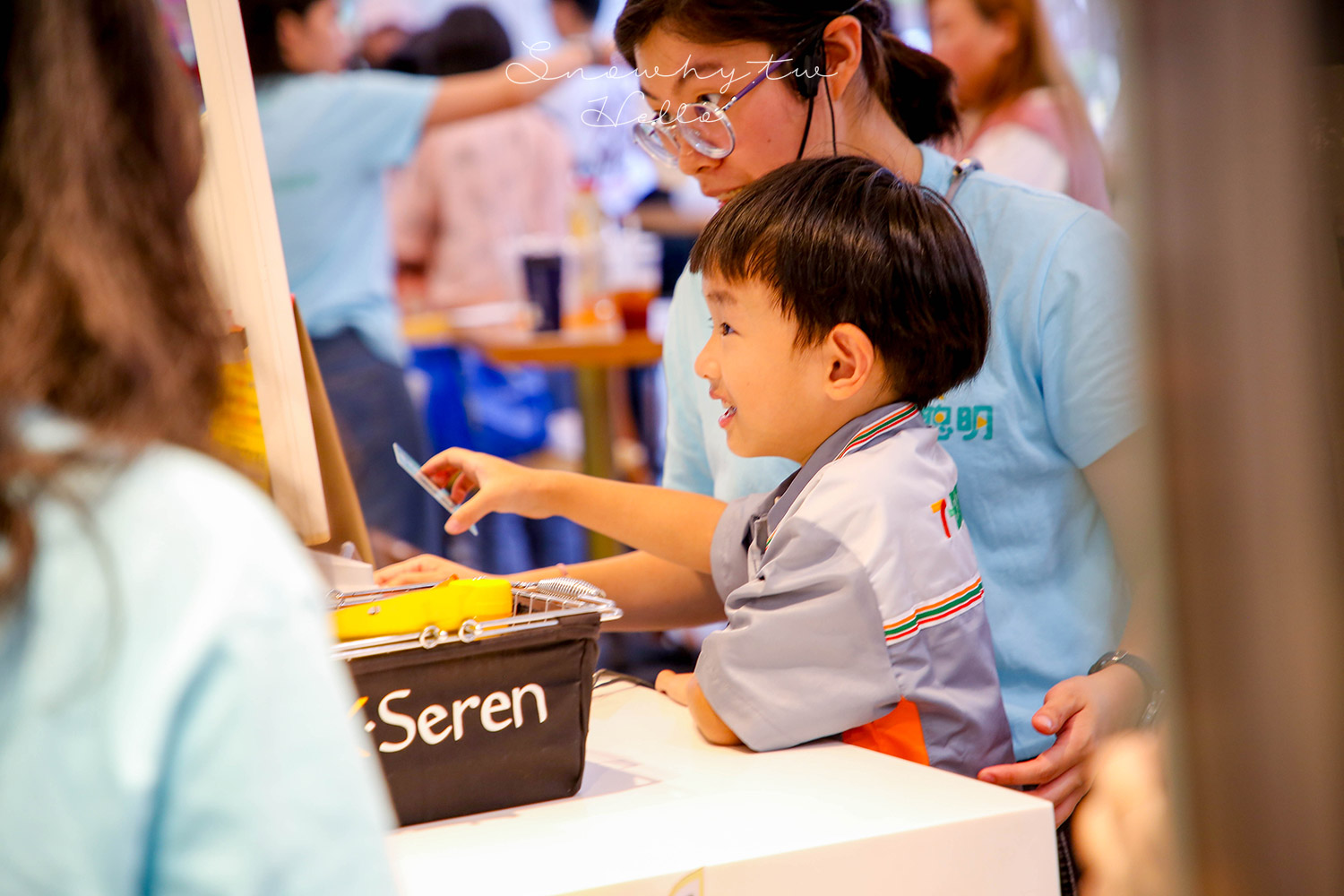4歲多的天天很久沒當小店長了,剛到時非常的反彈,甚至情緒崩潰到哭。一問之下才知道,他認為媽媽沒有問過他就帶他來參加活動,因為他並不想參加。這孩子終究是長大了,直到我去也去借了件7-11的制服穿著陪他,才肯好好的跑玩流程。