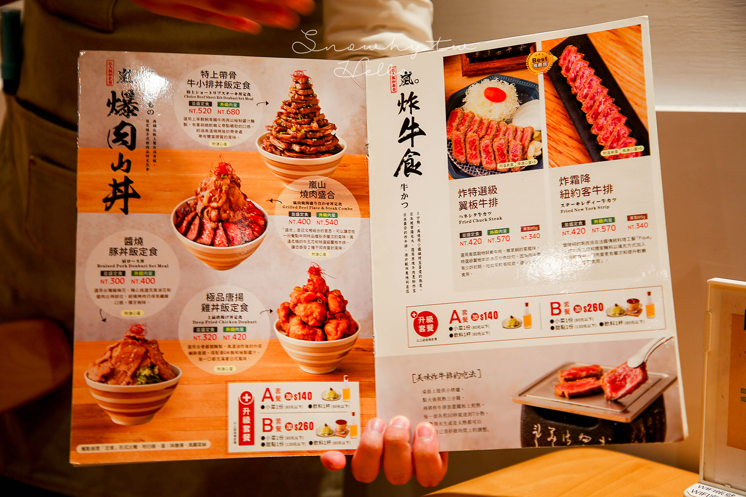 嵐山熟成牛かつ專売主要提供日式定食,有堆的像山一樣高的爆肉山丼、炸牛食、職人丼飯、手作漢堡排定食、秘製照燒雞腿丼飯定食、極厚切炸豬排等等。聽說他們的家的甜點也十分有名,曾推出的草莓系列、芒果系列等,在IG上都能搜到許多美拍,當然少不了經典的昭和布丁。但我們這次主要還是填飽肚子為主,就是吃肉吃肉吃肉!