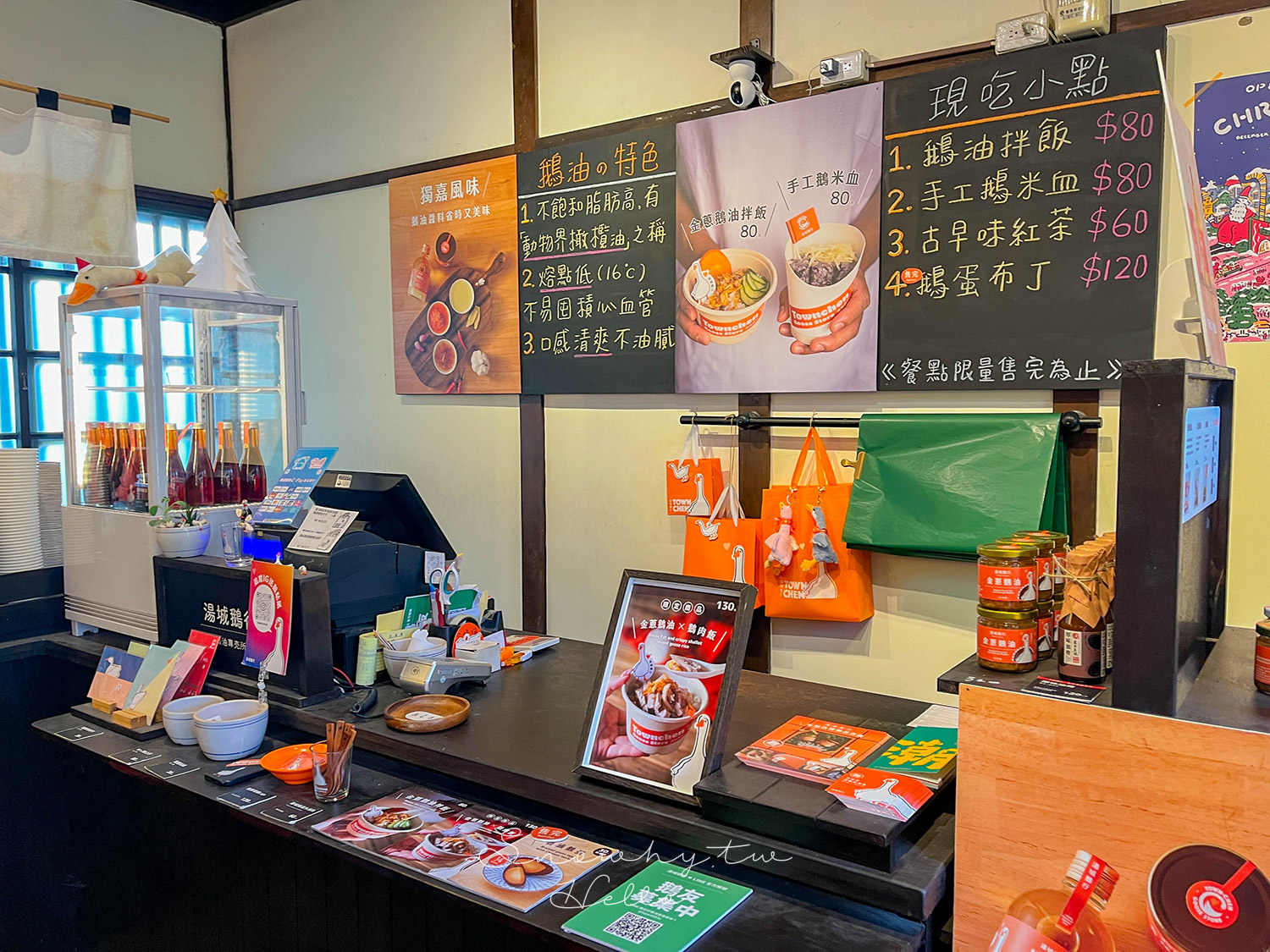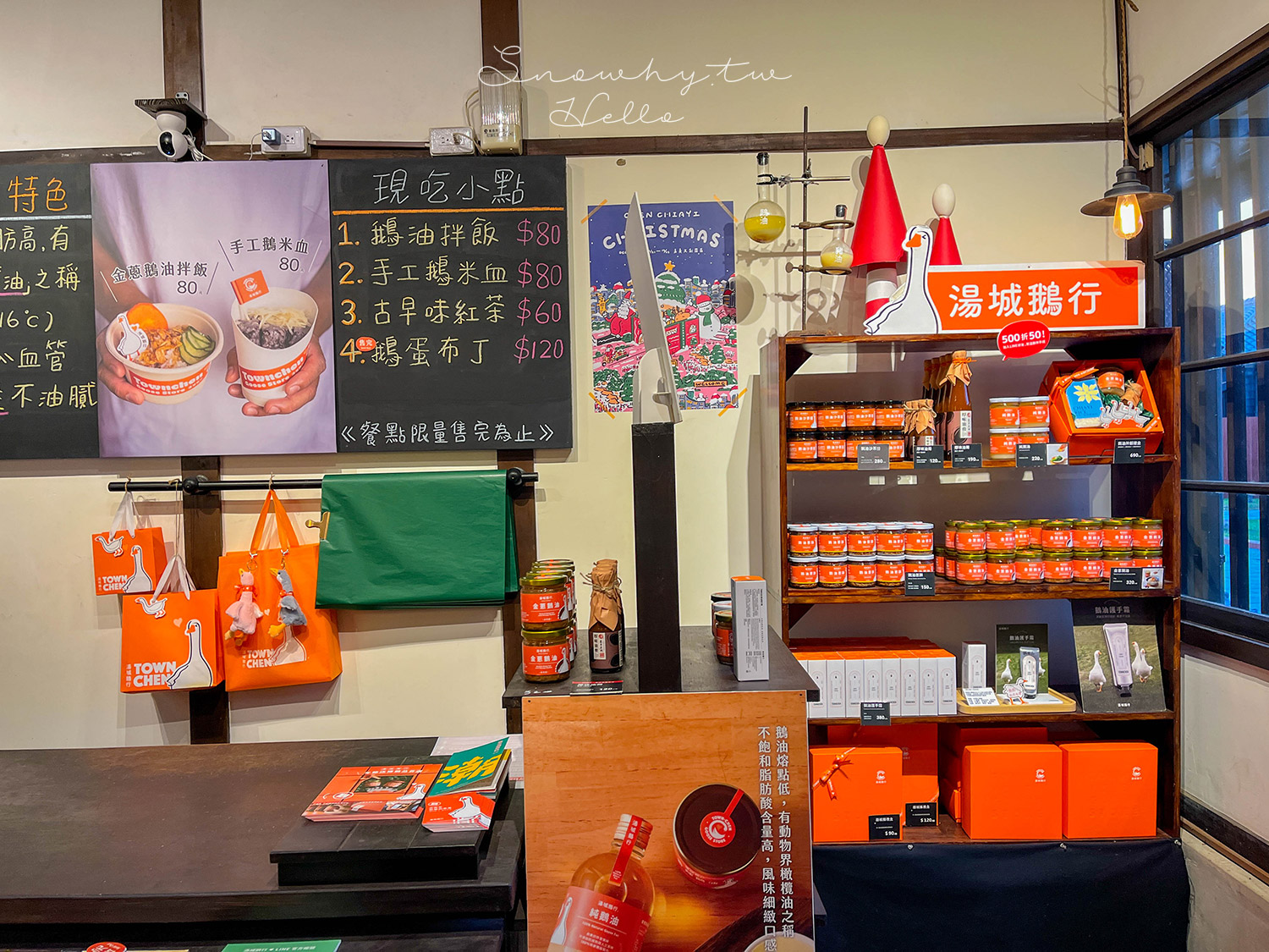 在嘉義檜意森活村Hinoki Village之中,有幾點我自己推薦的店家,來自嘉義的養鵝三代-湯城鵝行全新概念店(T14D )就是其中之一。湯城鵝行來自嘉義大林的三代養鵝人家,專注打造以鵝為主的精緻品牌。鵝油有著動物界橄欖油之稱,店內主打的「金蔥鵝油」,就嚴選純淨鵝油與紅蔥頭,簡單就可料理出香氣濃郁的鵝油拌飯。 店內也推出許多鵝油相關的商品手工鵝蛋捲 、鵝油護手霜等,十分及睛。